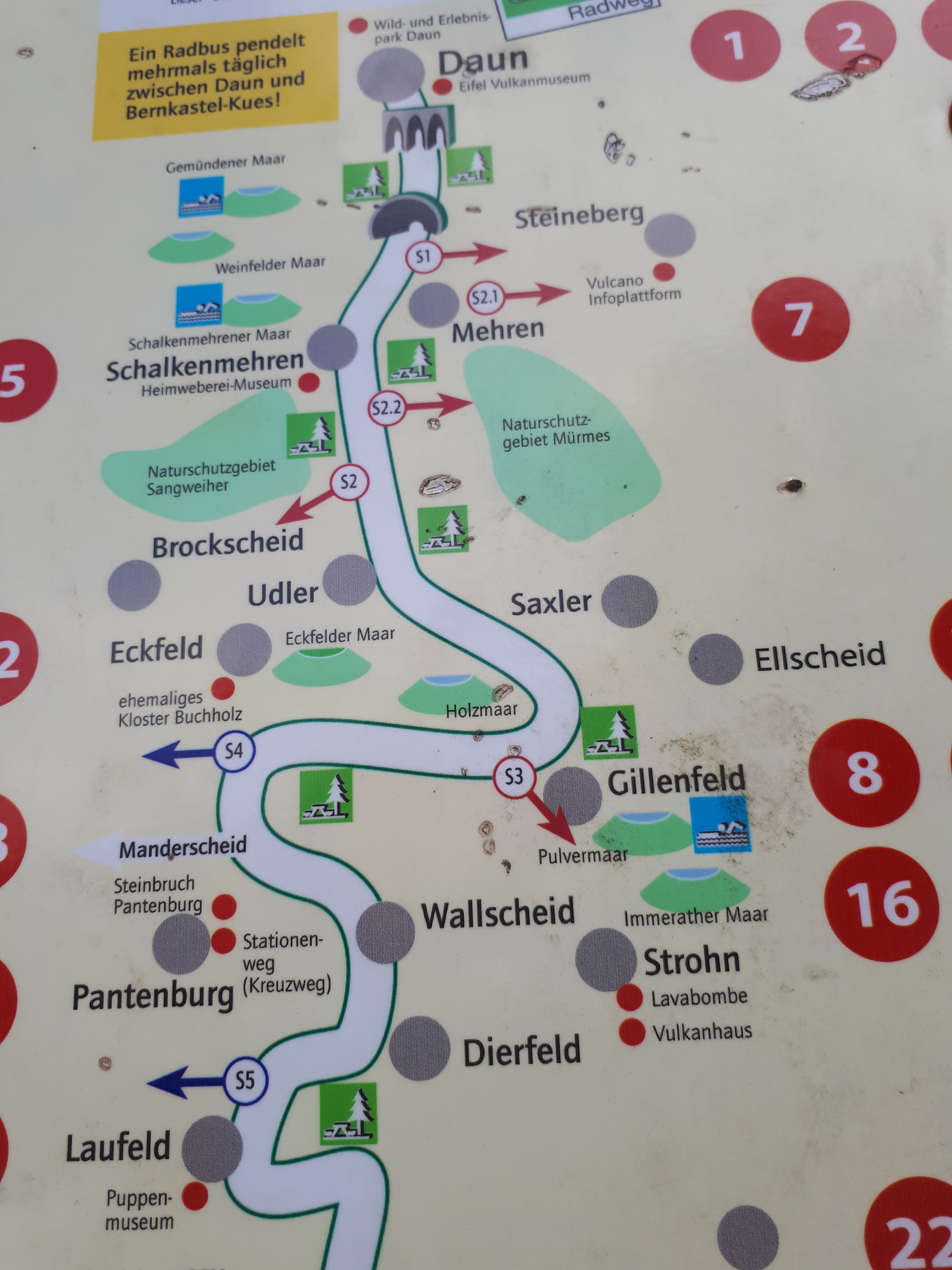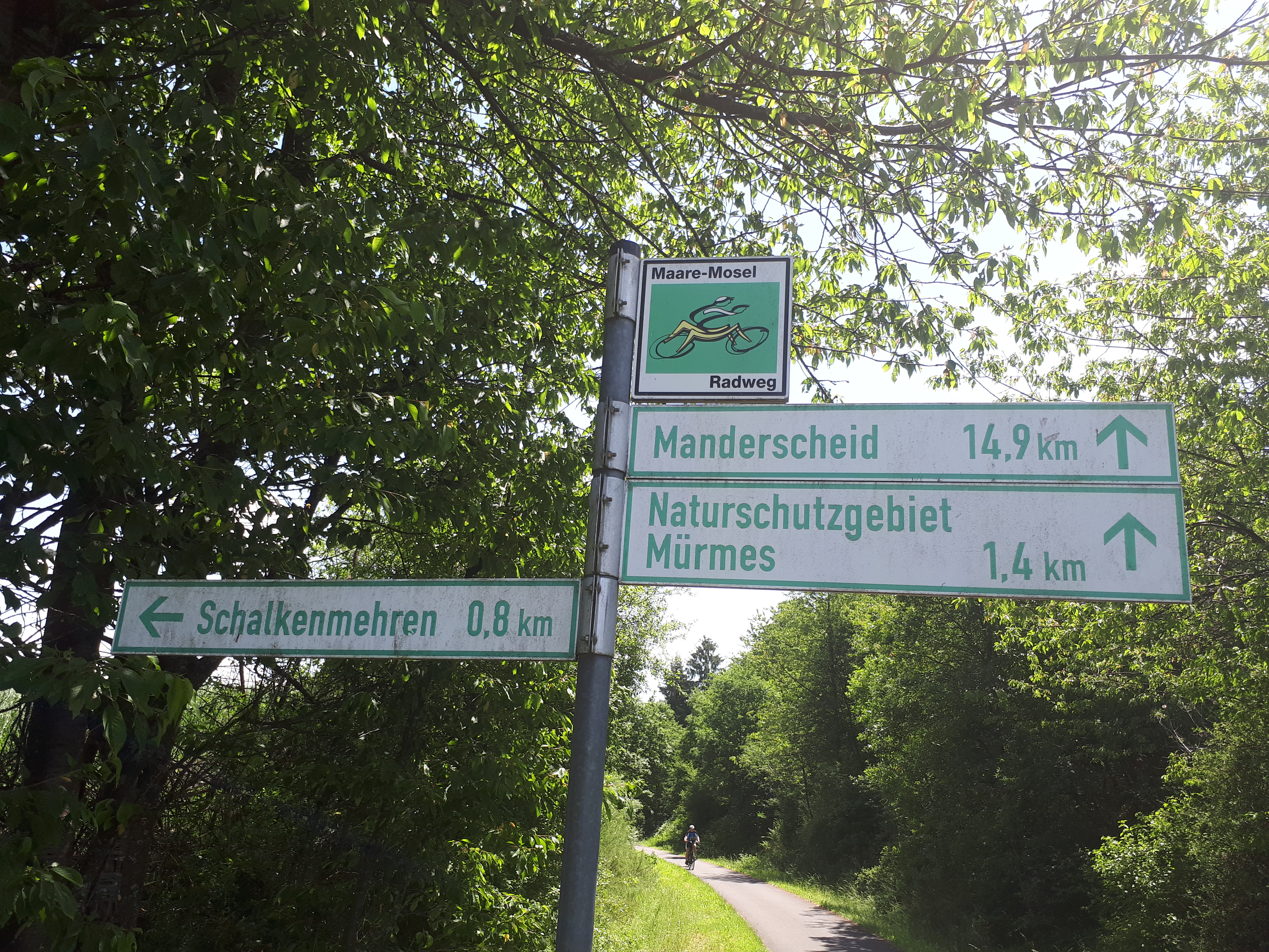 Ich habe eine Schleife gefahren nach Schalkenmehren, dem Drei-Maare-Dorf. Im Schalkenmehrener Maar darf man sogar baden. Eine zweite Schleife führte mich dann zum Holzmaar. Zu Fuß ging es mit dem Kinderwagen durch den Määrchen-Naturlehrpfad (nein, kein Tippfehler) und dann einmal Drumherum.