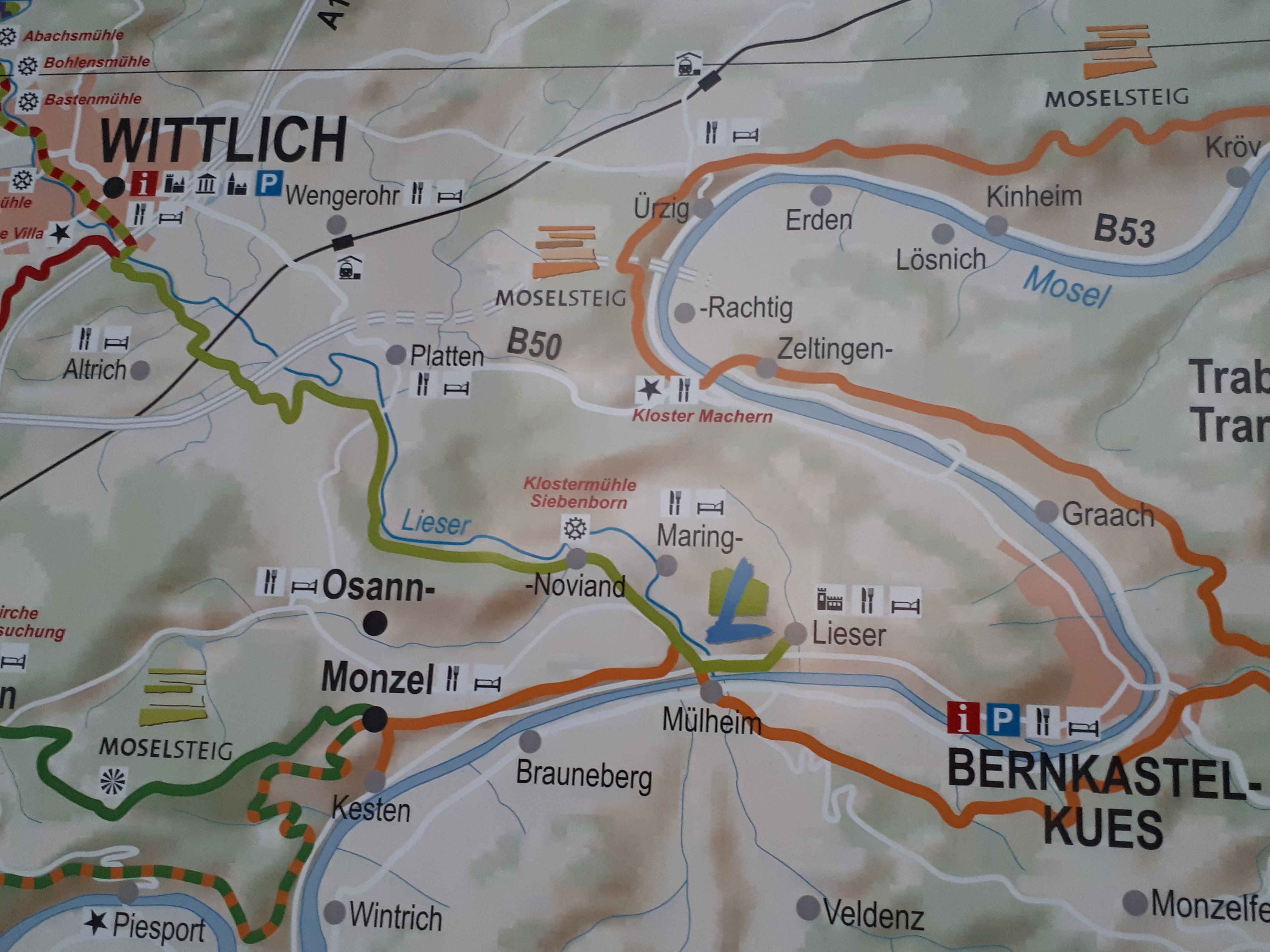 Die kleine Kreisstadt (ca. 20.000 Einwohner) Wittlich, genannt “Säubrennerstadt” bietet alles, was man braucht. Kleine und größere Geschäfte (auch Fahrrad-/Sportbekleidung und mehrere Fahrradreparatur- und Zubehörläden,…), viele Cafés, Eisdielen und Restaurants sowie Übernachtungsmöglichkeiten. Mittendurch fließt das Flüsschen Lieser, an dessen Ufer es sich im Sommer gut aushalten lässt. Auf diesen trifft man auch am Ende des Radweges wieder.