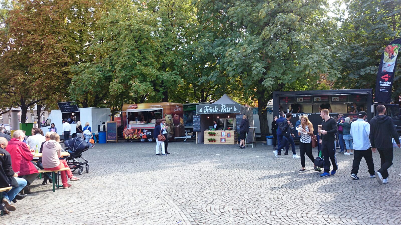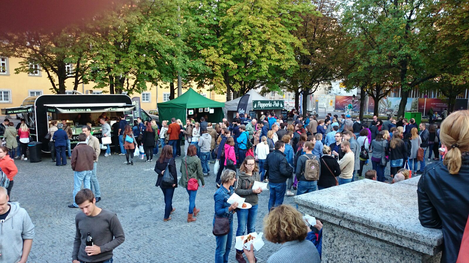 Ich fand die Atmosphäre auf dem Karlsplatz in Stuttgart wirklich angenehm. Ich war mittags gegen 16 Uhr dort und dann gegen 19 Uhr nochmal. Abends war deutlich mehr los. Ich habe also alles richtig gemacht und bereits mittags dort etwas gegessen. Abends hätte ich definitiv lange in einer der Warteschlagen gestanden. Es war echt gut was los – aber irgendwie gemütlich. Tischkicker, Bierbänke, Strandliegen,… Essen konnte man bei 15 verschiedenen Ständen bekommen. Außerdem gab es zwei separate Getränke-Stände.